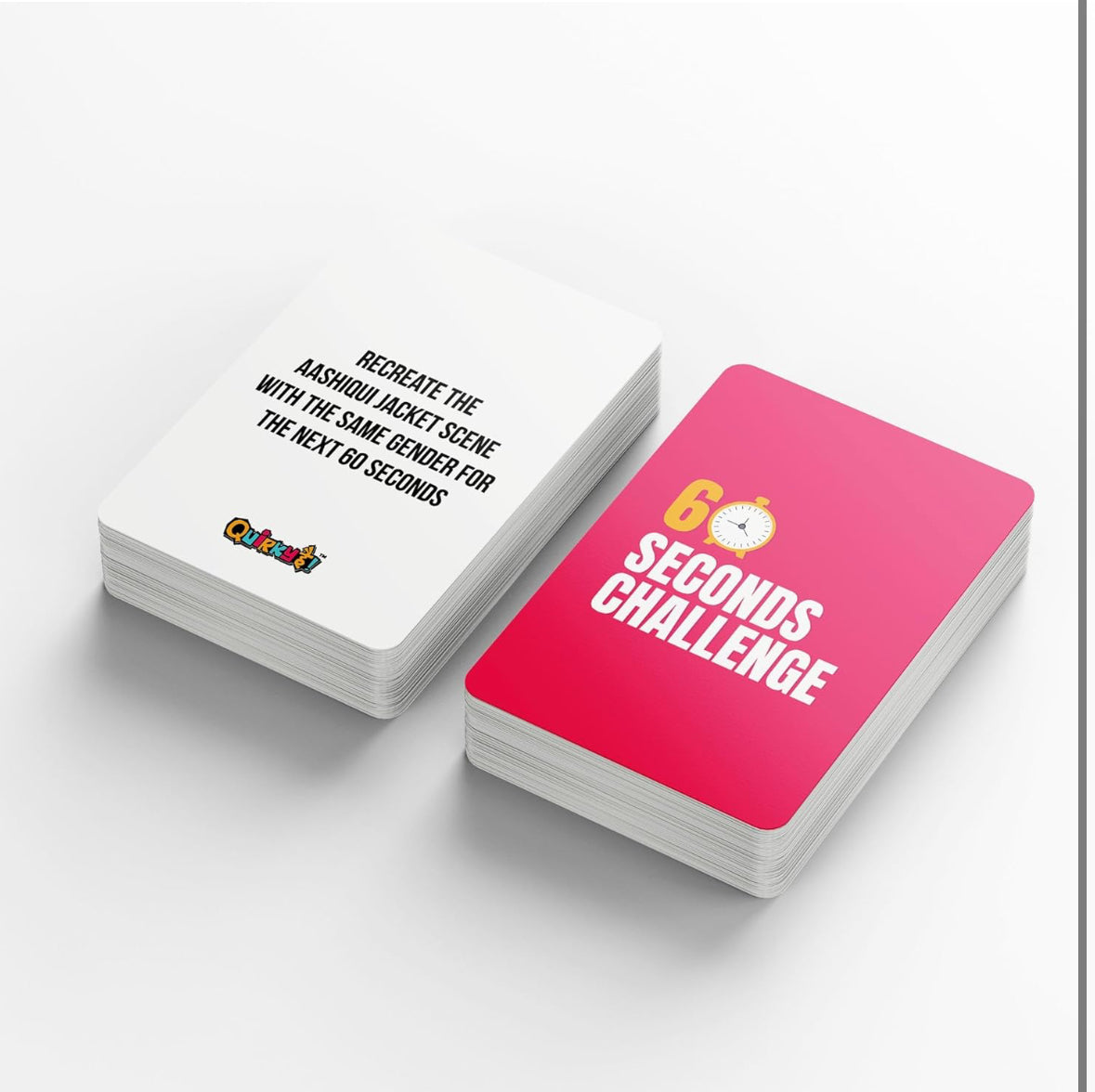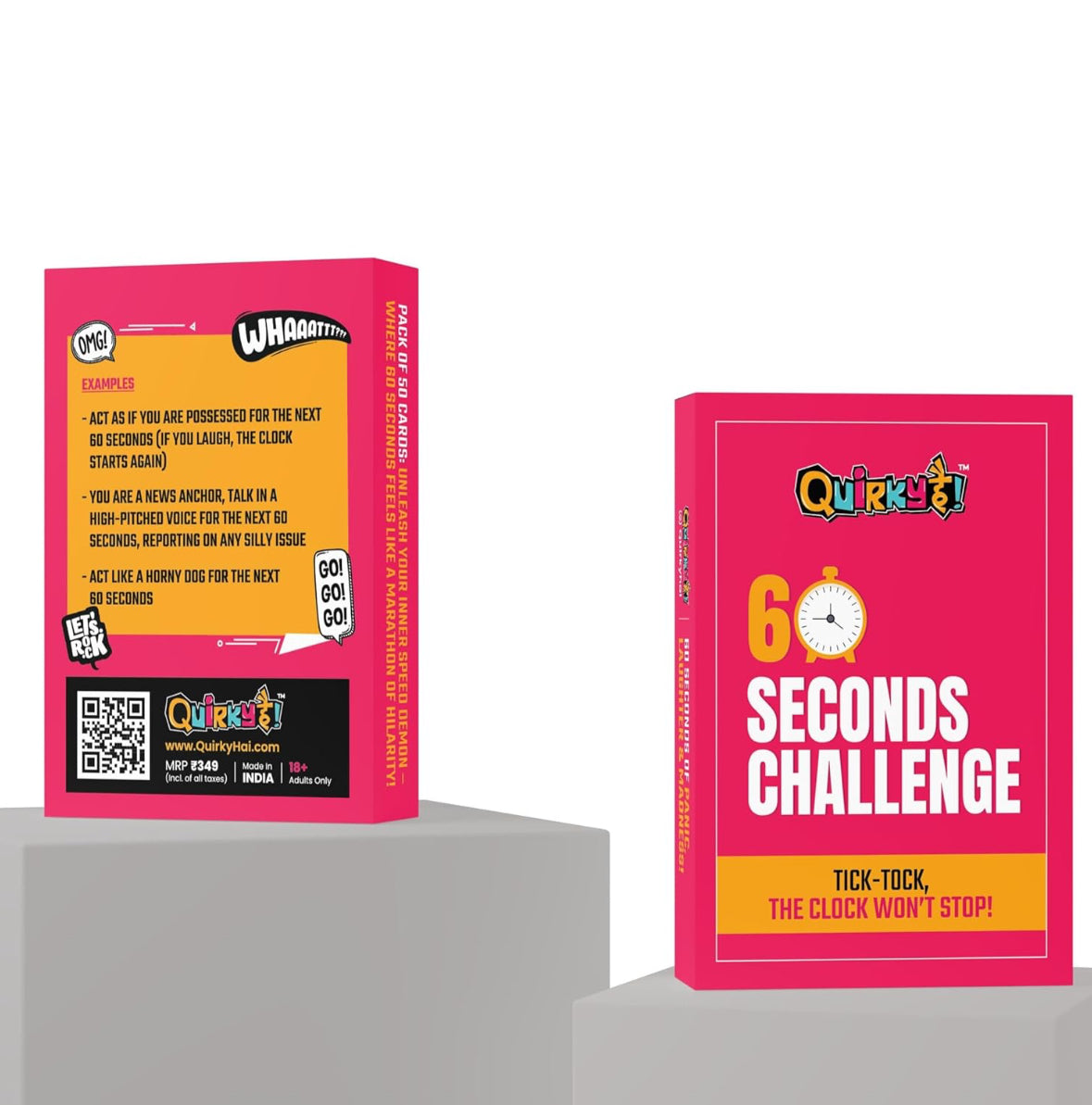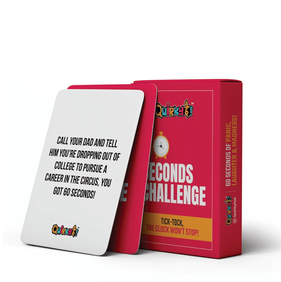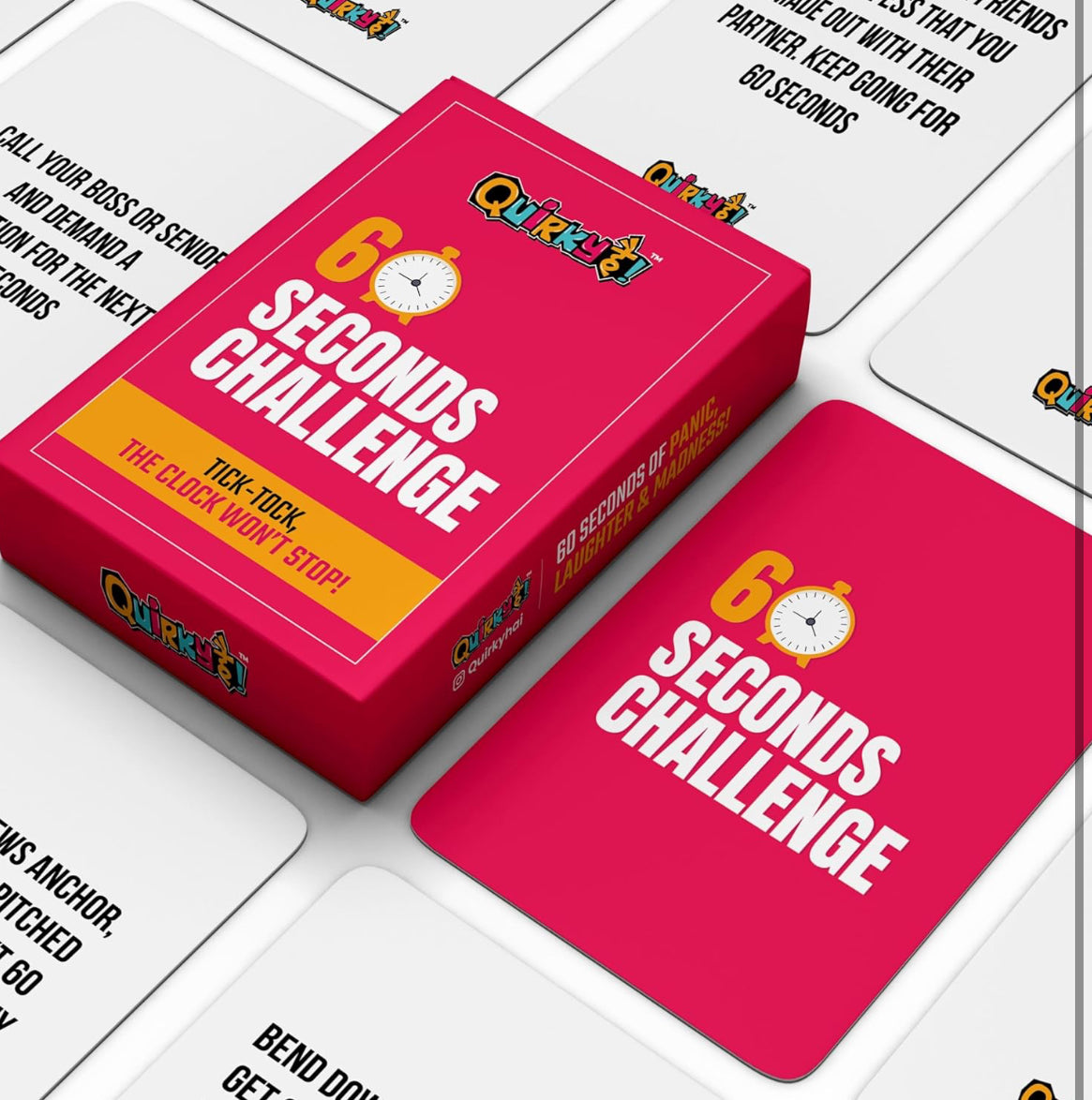 Think fast, act faster! 60 Seconds Challenge is the ultimate quick-play card game that tests your speed, skill, and wits. Players draw challenge cards and have just one minute to complete hilarious tasks, answer tricky questions, or perform crazy actions.