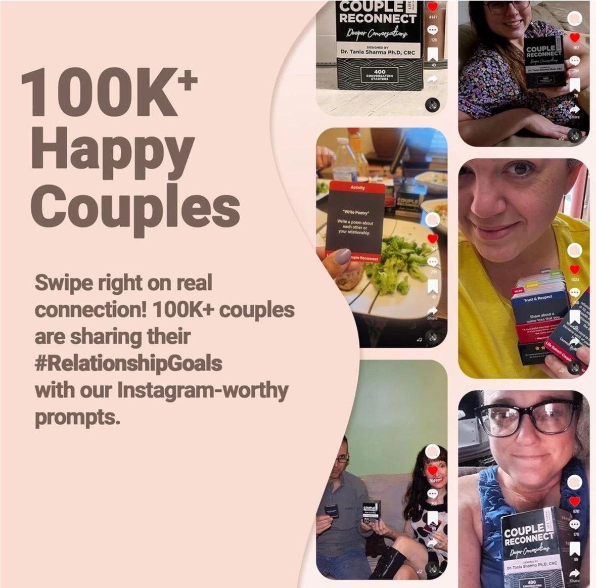 Couple Reconnect is a relationship-building card game designed to bring couples closer. Through meaningful questions and fun challenges, couples can strengthen communication, rekindle romance, and learn more about each other — one card at a time.