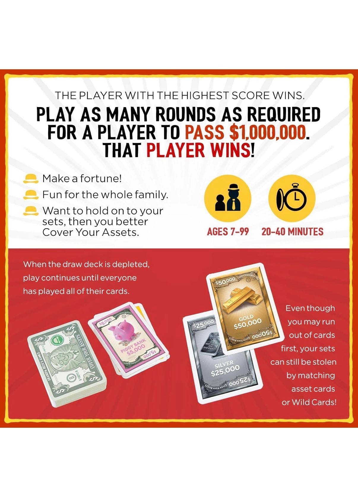 Cover Your Assets is a fast-paced, competitive card game where players race to build the most valuable asset stacks while stealing, blocking, and sabotaging opponents along the way. Nothing is safe, and no one plays nice.