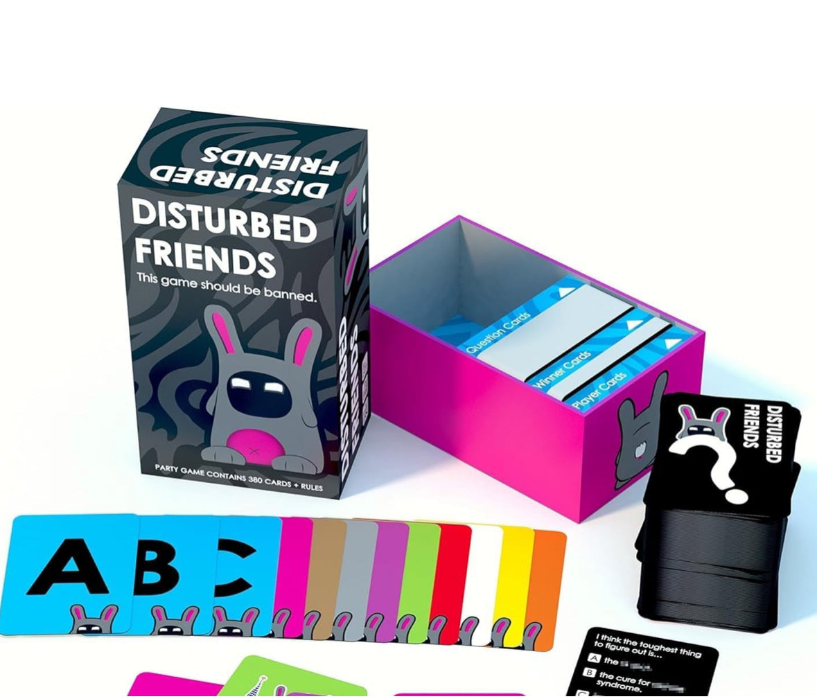 Disturbed Friends is an adult party game designed to find out how disturbed your friends really are. Players vote on how others would respond to truly messed-up questions. The goal? Be honest… even if it’s horrifying. Wild, inappropriate, and perfect for groups that love dark humor.