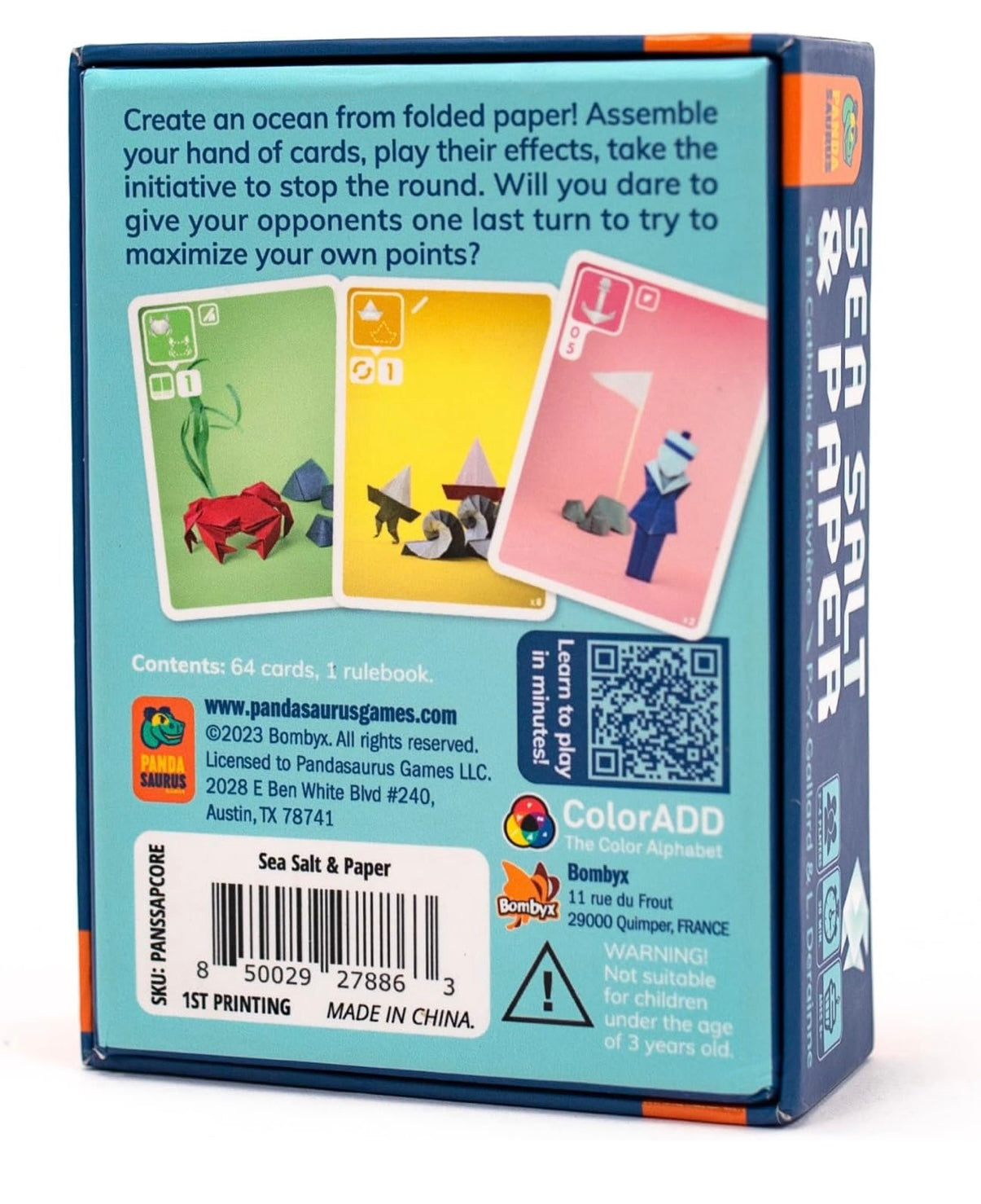 Sea Salt & Paper is a beautifully designed card game where strategy meets risk-taking. Players collect sets of ocean-inspired origami cards to score points — but timing is everything. Push your luck too far, and you might lose it all.