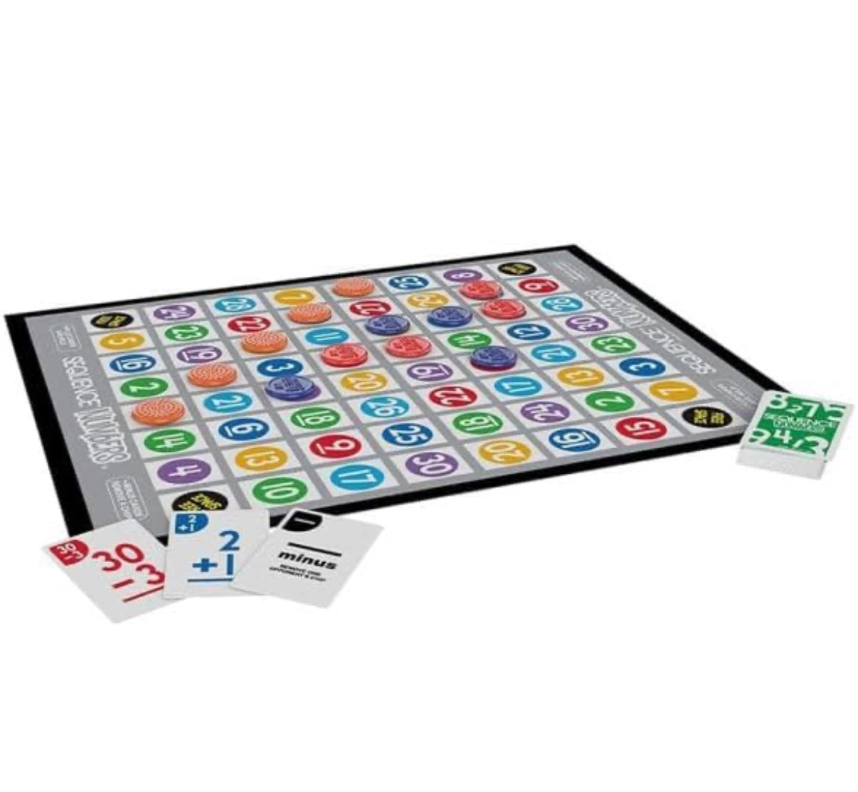 Sequence® Numbers puts a fun, educational twist on the classic Sequence gameplay by replacing cards with numbers and math operations. Players use addition and subtraction cards to create number sequences on the board while placing chips to block opponents and secure winning lines.