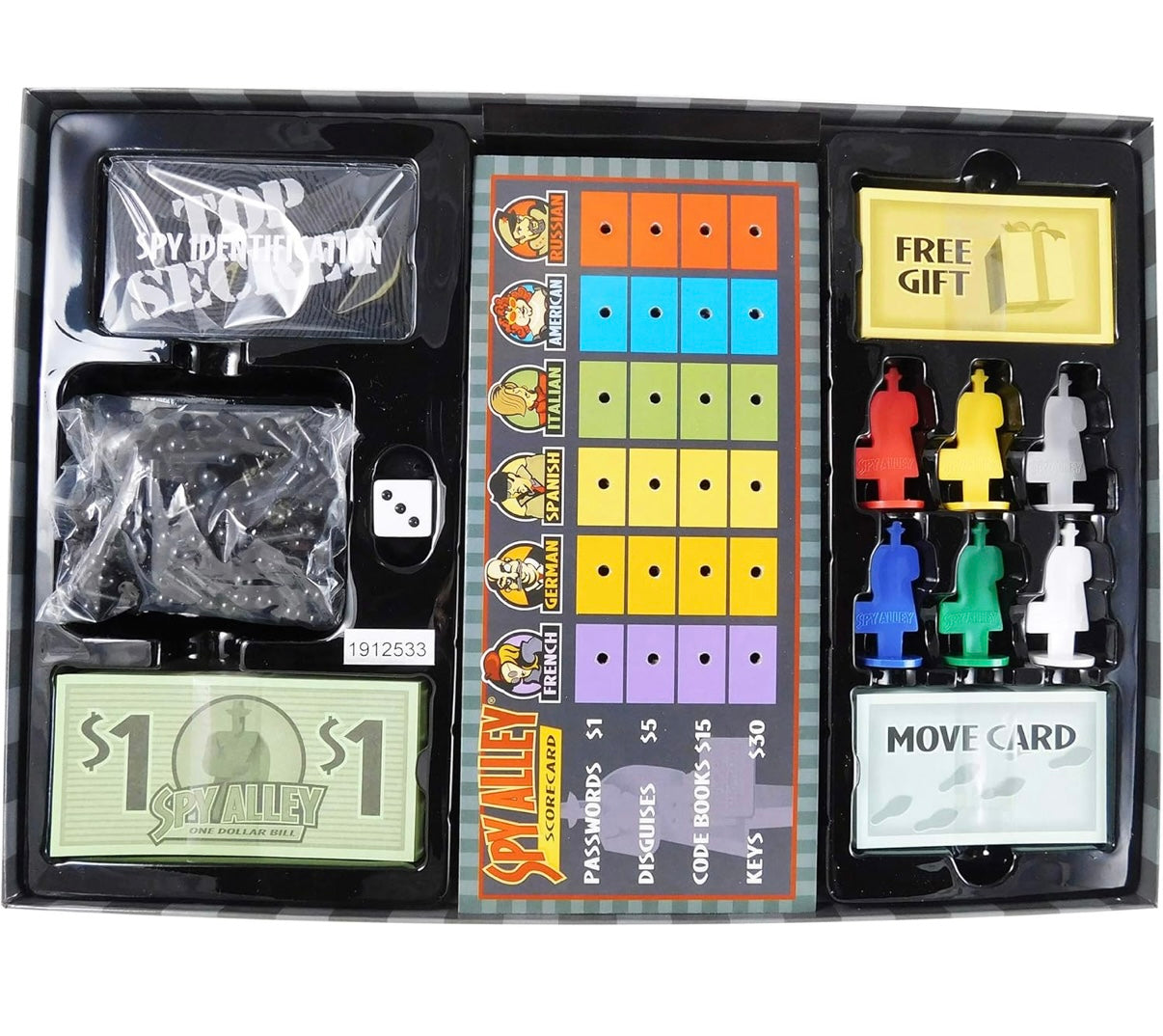 Includes: Game board, spy identification cards, money, equipment cards, and playing pieces