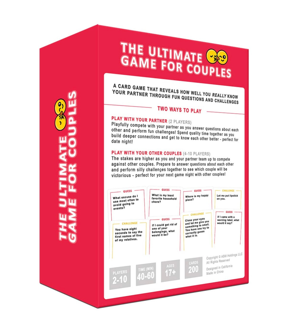 Two Fun Ways to Play – Whether it’s just the two of you or a couples’ game night, choose between intimate one-on-one gameplay or team up to compete with other couples.
