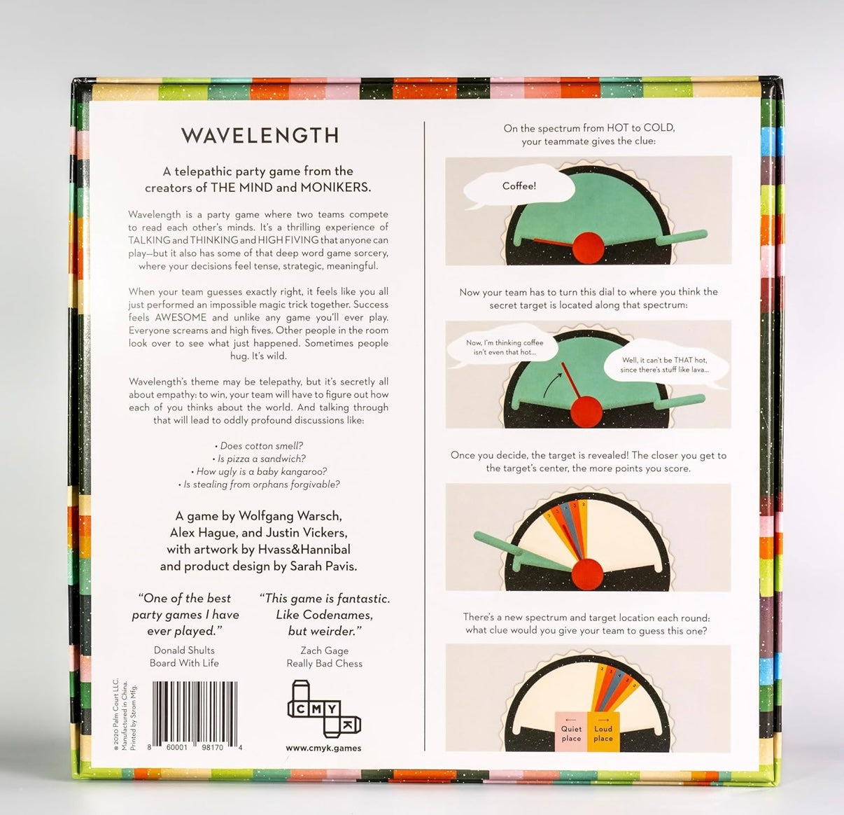 Wavelength is a unique and addictive party game where two teams compete to read each other’s minds. One player- the Psychic- knows the position of a hidden target on a spectrum (like Hot to Cold or Courageous to Cowardly), and gives a clue to help their team guess where it is. The closer the guess, the more points the team scores!